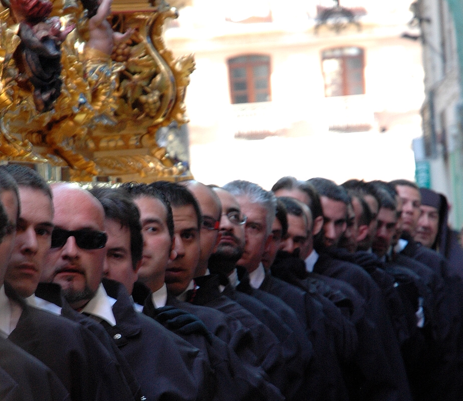 Restaurangerna brukar vara öppna till långt inpå natten. Maten är god. Familjerna samlade, vännerna kramas, kindpussas. Barnen springer runt och samlar stearindroppar från nazarenernas långa ljus till större och större bollar. Ibland lyfter någon lite på sin förklädnad och ler mot dem, droppar lite extra stearin, passar på att ta en klunk öl, eller några bloss på en cigarrett. Kontrasten gör bara den sorgsna trumpetmusiken ännu mer suggestiv.