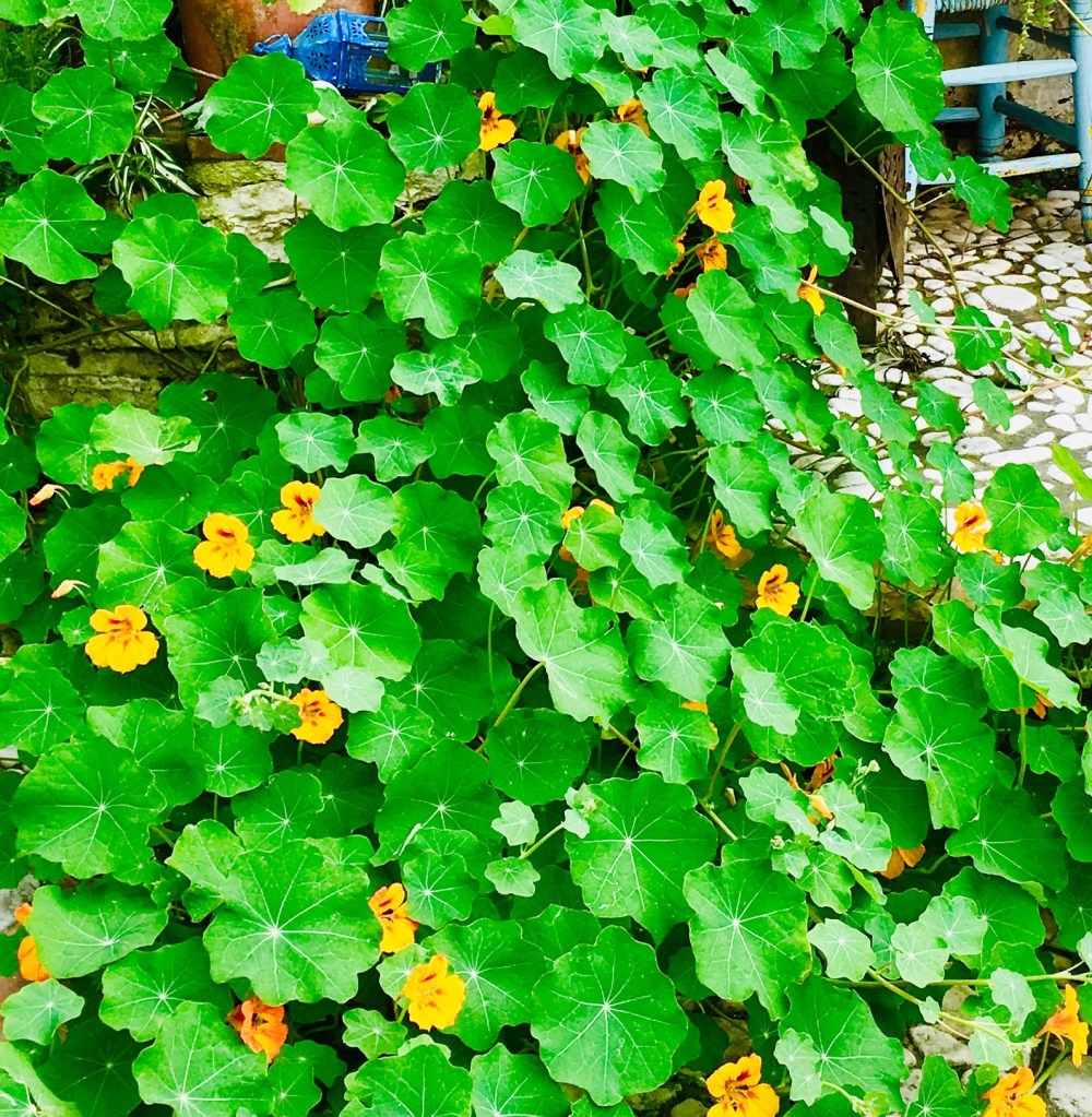 Blomsterkrassen har fått fnatt och växer överallt i trädgården. Snart kommer man inte fram. Det gör den varje år. Så småningom måste man klippa ner det, för den vissnar. Och får ohyra. Men det gör jag inte förrän det blir nödvändigt. Jag tycker det är härligt att kryssa fram bland blommorna. Dessutom är de ätbara. Och snyggt i maten.