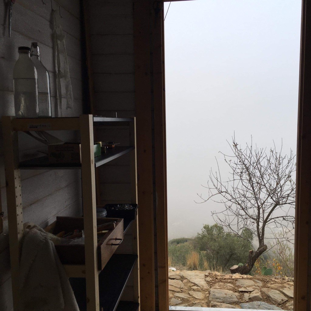 Vi byggde upp en liten stuga uppe på campo. Stuga och stuga… det var mer som en byggsats, en friggebod. Vi använde ingen cement. Grävde bara ut lite, och planade ut med stenar. Ingen större inverkan på omgivningen. Den är tänkt att ha till att förvara verktyg och annat som behövs för campo. Vi bytte till oss den av Ana och Robert, som inte ville ha den kvar i sin trädgård. Vi monterade ner den själva, och byggde upp den igen på sin nya plats uppe på berget. Det var ett djäkla jobb. Men det blev fint. Vi lade nytt takpapp på taket och tjärade och allt.